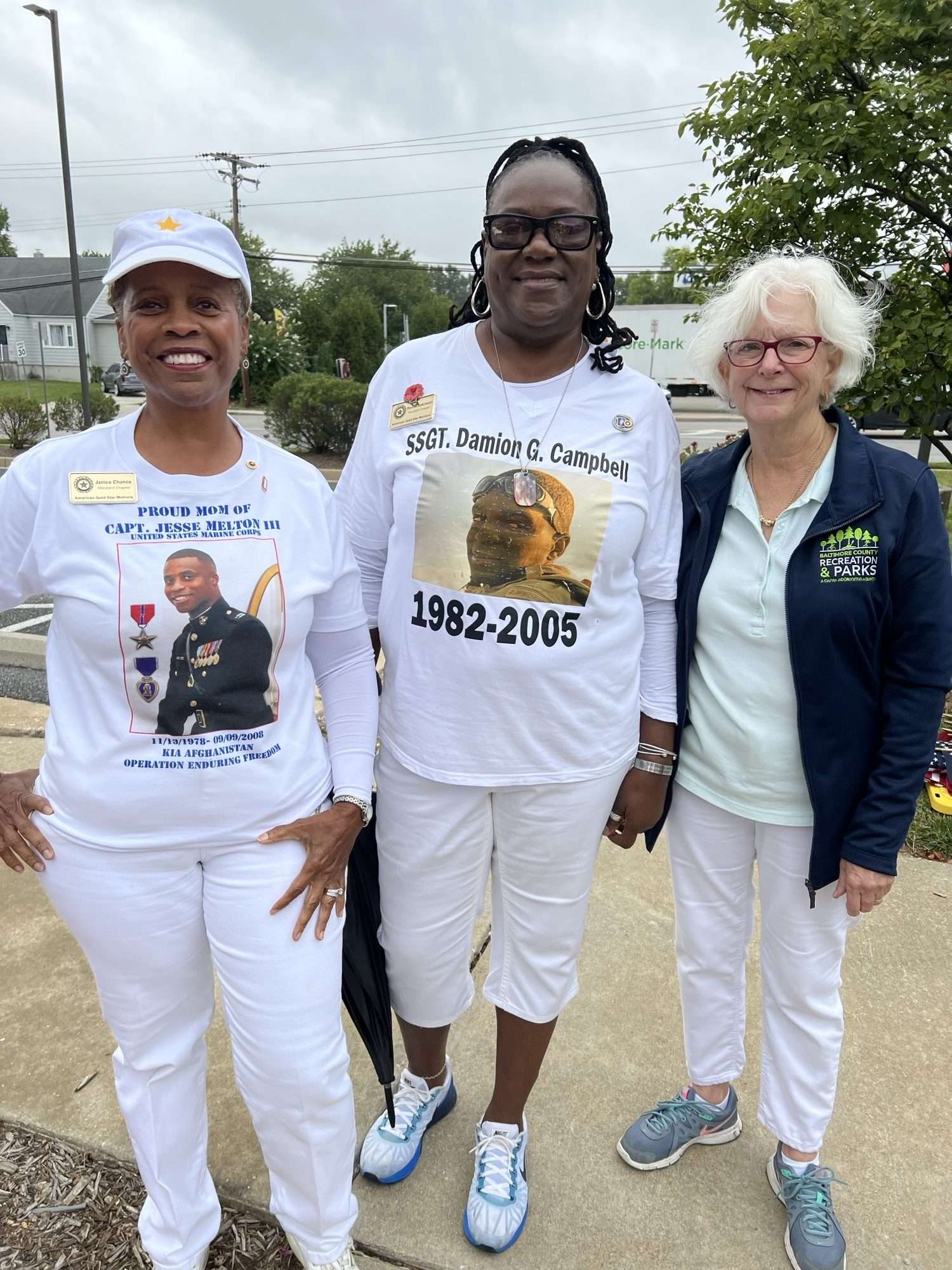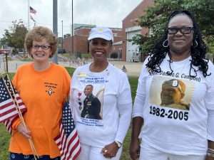 Mr. Chuck Ritz, Founder of the Hope and Peace Foundation invited Gold Star Maryland Chapter mothers to participate in his foundation’s 14th Annual 9/11 Path and Field of Honor event. Janice Chance and Donna Robinson represented the Maryland Chapter. This year the Path of Honor and Field of Honor flag event was held twice because Chuck Ritz hosted the Patriot Day Ride a week earlier this year. Janice and Donna assisted with the placement of flags around the Baltimore County Firehouse. They joined Chuck, Fire Fighters, Police officers, Veterans, a few elected officials and a group of other Patriots. Although it was raining lightly in the beginning, God intervened and stopped the rain. Therefore, as planned, 2,977 Flags were placed along Putty Hill Road to represent our fellow Americans who were killed during the 9/11 attacks. Flags were also placed on a hill located in the Putty Hill shopping center named “The Field of Honor” in honor of the 158 Maryland military service member Heroes who made the ultimate sacrifice since the start of the “War on Terror”. The Path and Field are visual reminders to the students who attend Parkville Senior High School, residents, business owners, and the thousands of commuters who drive on Putty Hill Ave that we have not forgotten our citizens who were killed during the 9/11/2001 attack. The Maryland Chapter moms are grateful to Chuck for providing another opportunity for them to serve, and they are also grateful to the many other Patriots for their efforts and commitment to do all that they are able to remind U.S. citizens to NEVER FORGET TO HONOR & REMEMBER our Fallen Heroes and their families. FREEDOM IS NOT FREE! The saying is true “WE LIVE IN THE LAND OF THE FREE BECAUSE OF THE BRAVE”!