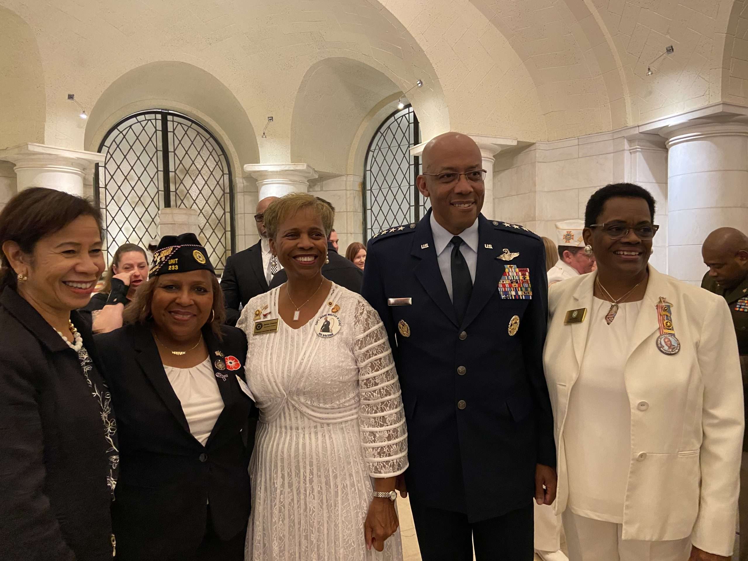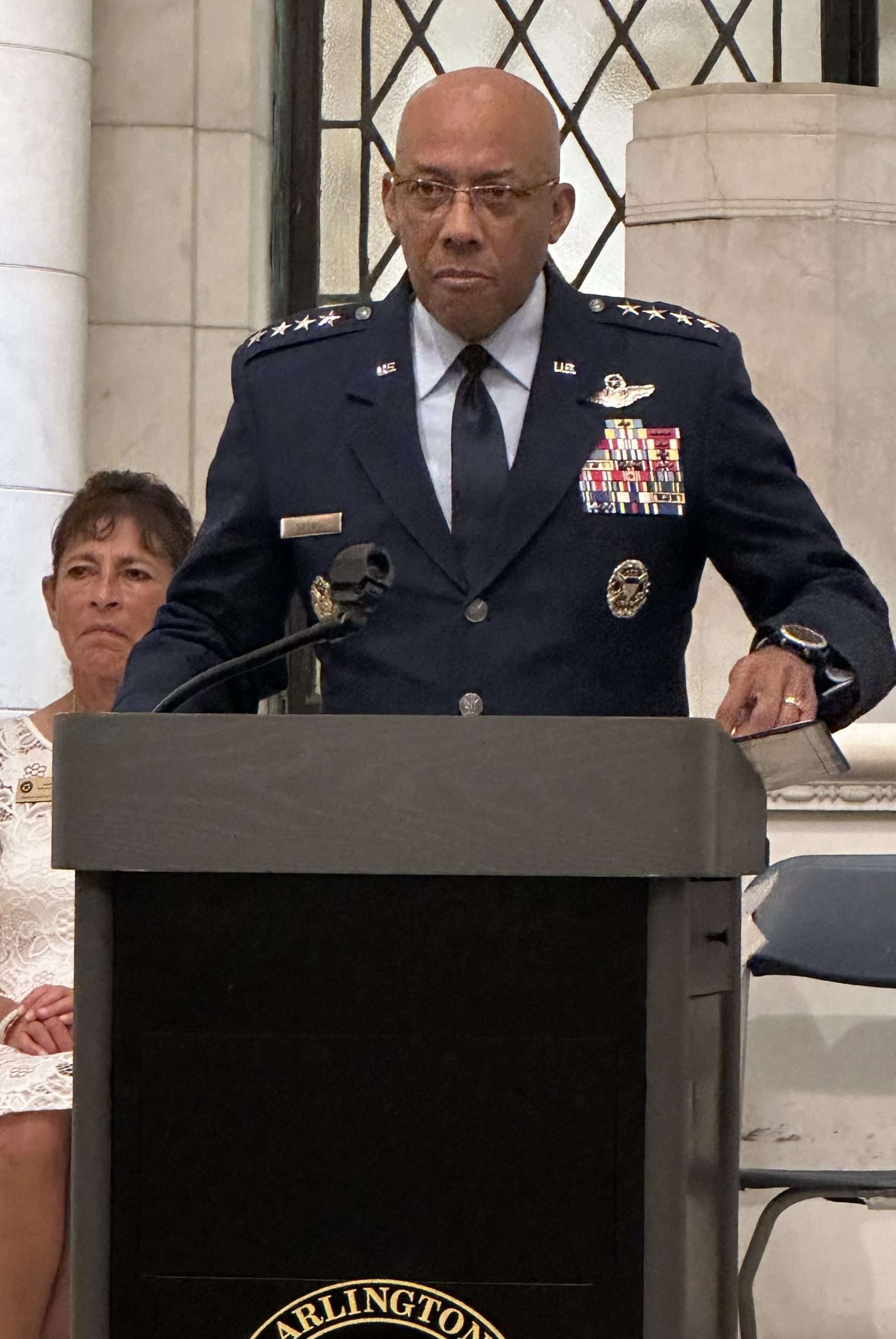 A beautiful wreath was laid at the Tomb of the Unknown soldier by AGSM’s President, Patti Elliott as she was accompanied by her son, Brad. After the wreath laying ceremony, attendees were invited in the Amphitheater for the Commemoration Ceremony. The ceremony began with a rendition from the U.S. Army Band “Pershing’s Own” brass quintet. Immediately following the processional of the National Executive Board, the ceremony began with the presentation of colors, national anthem, and the pledge of allegiance. As a ceremonial tradition, the National Secretary for AGSM, Theresa Karlson, read the Proclamation as declared by the President of the United States and as approved by Congress on June 23, 1936. Patti welcomed all the guests and dignitaries before she introduced the keynote speaker, General Charles Q. Brown, Jr., the 21st Chairman of the Joint Chiefs of Staff.