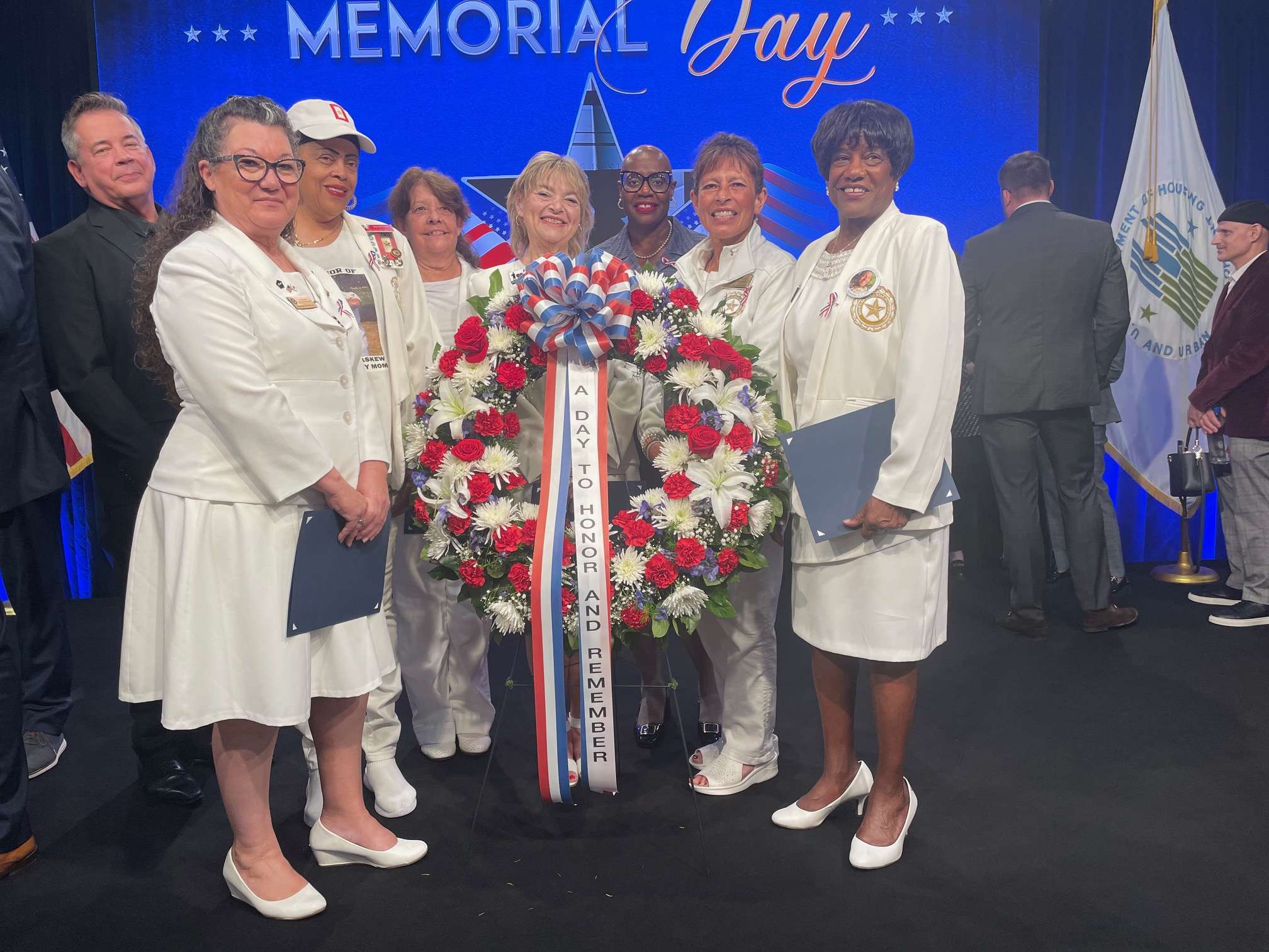 On Thursday, May 22, 2025, HUD held the Annual Memorial Day Ceremony to honor Fallen Heroes at its Headquarters in Washington, DC. The program theme was “Honor and Remember.” American Gold Star Mothers President Patti Elliott attended along with some of the American Gold Star Board Members, and Maryland Gold Star Mothers, Paula Davis and Joy Goode. The program began with the Toll of Bells and Opening Remarks from Jerryl Bennett, United States Army (Veteran), Chair, Veterans Affinity Group, Public and Indian Housing, United States Department of Housing and Urban Development. The Mistress of Ceremonies was Eva Fulton, United States Army (Veteran), Vice-Chair Veterans Affinity Group, Program Analyst, Office of Policy, Programs, and Legislative Initiatives, Public and Indian Housing, U.S. Dept of HUD. After the presentation of Colors from the United States Marine Corps Color Guard, the ceremony continued with a video message from the Honorable E. Scott Turner, Secretary of the United States Department. Of Housing and Urban Development. The Occasion was given by Cheryl Monroe, CW5, Chief Warrant Officer Five, United States Army (Retired). The Call to Action was given by Jozetta Robinson, United States Marine Corps (Veteran), Director, Executive Secretariat, Office of the Secretary, United States Department of Housing and Urban Development. A Veteran’s Call to Continue the Mission was given by Jason G. Loughran, United States Navy (Veteran), Region II, Regional Administrator, Office of Field Policy and Management, United States Department of Housing and Urban Development. The Keynote Speaker was Rear Admiral Hal Pittman, United States Navy (Retired), Director, Office of Public Affairs, United States Nuclear Regulatory Commission. After his message, the Gold Star Mothers were presented with a Certificate of Remembrance. The Mothers joined the Speaker on stage for the laying of the Memorial Wreath. A moment of silence was observed, and TAPS was played by Dwane Starlin, Bugles Across America. The Ceremony was live-streamed throughout HUD. We look forward to attending this wonderful ceremony each year.