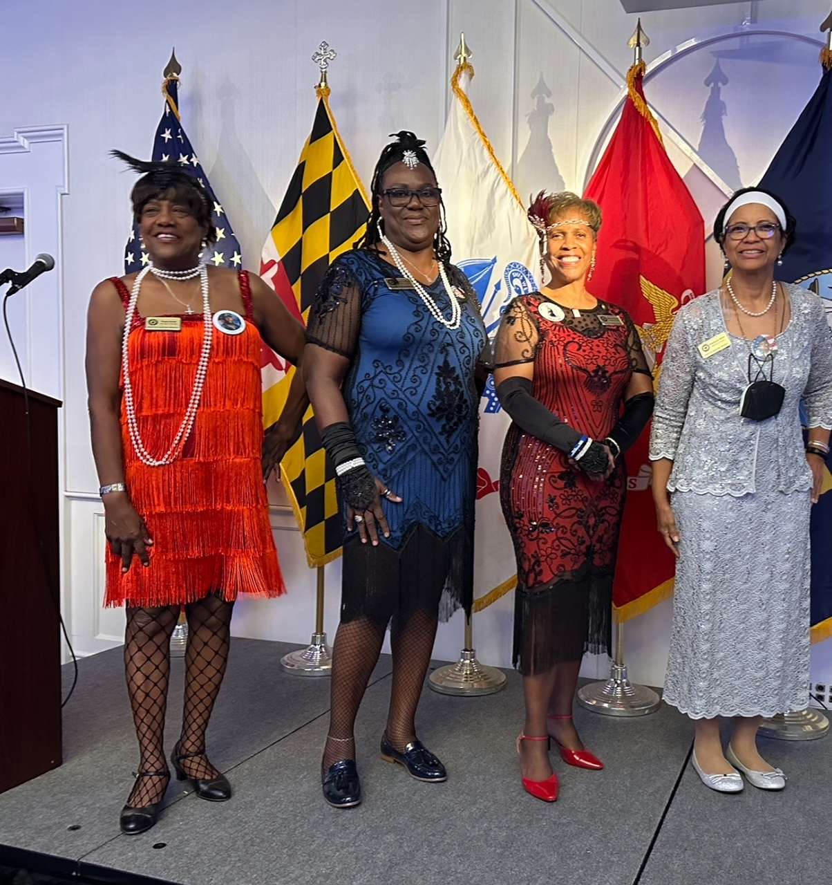 On September 28, 2024, Maryland Chapter Gold Star Moms Donna Robinson, Paula Davis, Janice Chance, Stephanie White and their guests attended the AUSA 20th Annual Fisher House Gala fundraiser. It was held at Water’s Edge Event Center in Belcamp, MD. The first gala was held at Fort Monmouth, New Jersey, with which over 360 guests attended. On behalf of the Major General (MG) Harry Greene Chapter, Bob Gutjahr, President welcomed everyone to the Gala. Since 2004, the Monmouth and Aberdeen Communities have staged this event in support of the Fisher House Foundation. The Foundation raises funds that enables comfort homes to be built that are placed near major military and VA medical centers. There are currently 99 Fisher Homes, almost reaching a goal of 100 homes. Since its inception, the Foundation has saved military and veteran’s families an estimated $525 million in out-of-pocket costs for lodging and transportation for military and veteran’s families. Families stay at no cost while a loved one is receiving critical care. There were 54 sponsors for the event this evening. The AUSA Fundraiser committee selected “The Roaring 20’s” as their theme this year; therefore, many of the attendees wore attire from the 20’s decade. Guests also feasted on different foods that would be found from that era as well as many finger foods and desserts. Guests were also entertained with great music. An auction was held along with raffle drawings for 19 Gift Baskets. The Maryland Gold Star Mothers Chapter donated two beautiful gift baskets. The two baskets were a “Party like Gatsby Theme” Auction basket with a monetary value of $375.00 and “Fall Coziness” Auction basket with a monetary value of $300.00 created by Maryland Gold Star Mother, Lauren Seidler. Attending the fundraiser was a wonderful way to support our heroes and their families. Next year’s Fisher House Fundraiser event will be held on September 20, 2025 with a “Red White & Blue BBQ” theme.