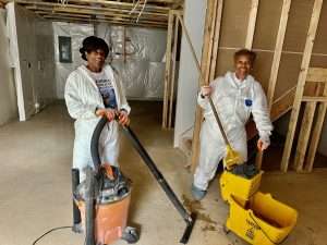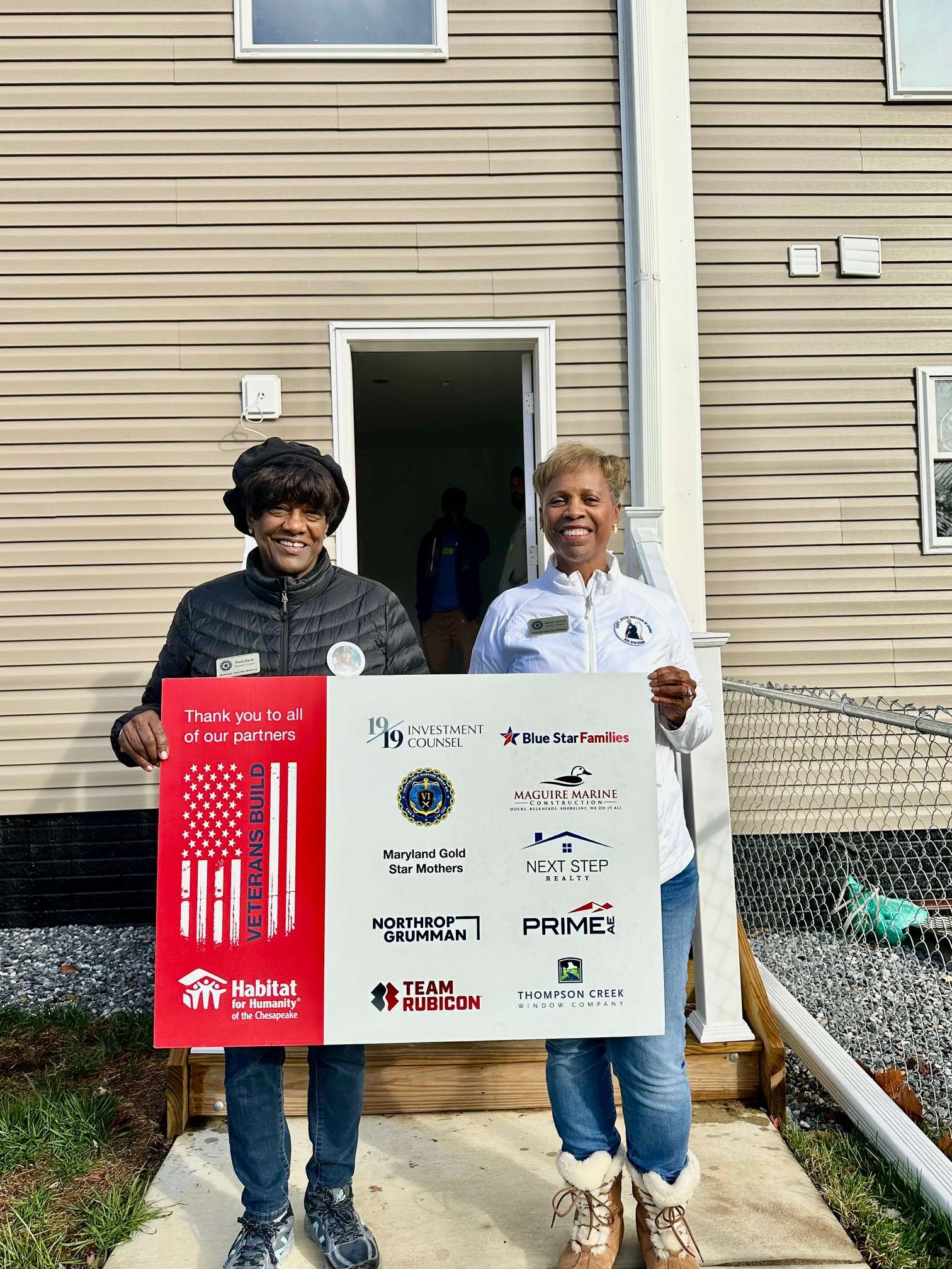 On November 15th, Maryland Chapter Gold Star Mothers were invited to participate in the Annual Habitat for Humanity of the Chesapeake Veterans Build by Brandon Jerome, Volunteer Engagement Manager.  Gold Star moms Janice Chance and Paula Davis represented the Maryland Chapter.  Joined with the Habitat Volunteer team, supporters, and volunteers from various organizations, they all came together to build affordable homes for families in need.  After a safety briefing, the Gold Star Moms were given training on how to paint baseboard trim, and how to prepare concrete floor to be painted.  A day of painting, dry vacuuming, and wet mopping the concrete floor was halted when lunchtime hit.  Lunch was donated by the Gold Star Mothers – Maryland Chapter.  The Moms were also able to share about the services and support that the Maryland Chapter provides, along with sharing briefly about their fallen heroes’ selfless service and sacrifice. We left with some soreness and the satisfaction of spending the day among friendly people, helping to build a home for a family in need. The volunteers and the Habitat Staff expressed their appreciation for our help.