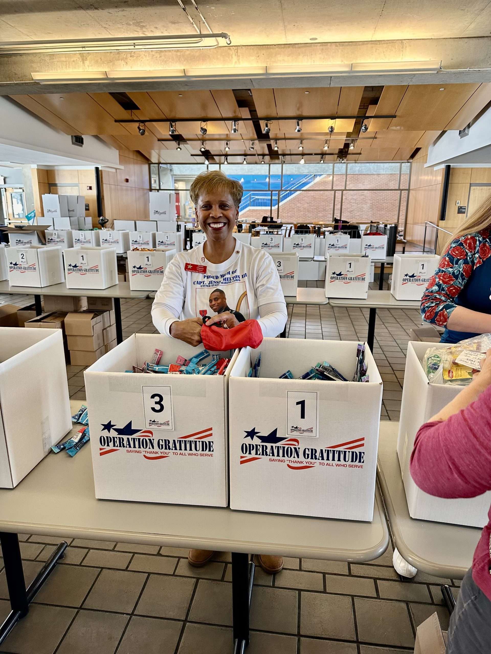 Operation Gratitude (OG) leaders invited the Maryland Chapter moms to join them and other volunteers to assist with assembling care packages during their two-day Care Package Assembly Day events for First Responders supporting the Presidential Inauguration. The goal was to assemble 8000 care packages. The care packages will be a special reminder to our First Responders that Americans across the nation support them and appreciate their service and sacrifice. Janice Chance represented the Maryland Chapter. Janice served alongside several Blue Star wives, patriotic volunteers, and OG staff. Ms. Meg Barron, OG Executive Director was in attendance. She not only warmly welcomed the volunteers, Ms. Barron also served alongside the volunteers and her staff.