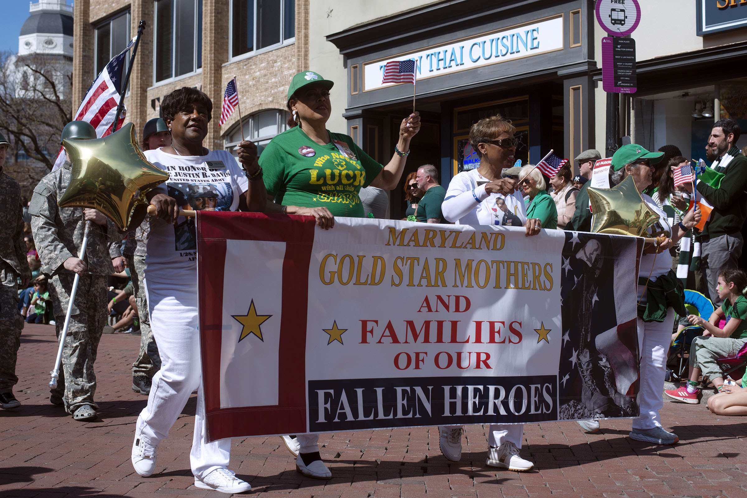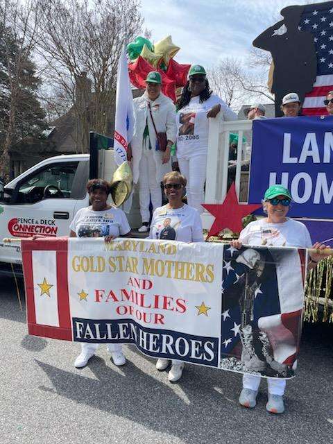On Sunday March 17, 2024, Gold Star Mothers Maryland Chapter participated in the Annual St. Patrick’s Day Parade in Annapolis, Maryland. The Warrior Events’ Leadership team, including John O’ Leary, Bob Saunders, and Paige Havens, did an outstanding job as usual coordinating the Warrior Events float and volunteers sponsored by Fence and Deck Connection, Inc. Gold Star Moms Theresa Karlson, Paula Davis, Janice Chance, Donna Robinson, Joy Goode and Gold Star Dad Greg Goode had a great time as they were amazed at all the floats, attendees and observers. One of the Warrior Events floats included big wooden letters that spelled out HERO that included several Maryland fallen heroes’ pictures, which were affixed to the letters. The other float had two shadow figures of a military figure saluting and the battle cross statue that honor all our military and fallen heroes with the saying “Land of the Free, Home of the Brave”. The Fence and Deck Connection float had a huge duck on it with the saying “Deck, Deck, Goose”! The course started at Amos Garrett Blvd and ended at Annapolis City Docks. The crowd erupted in applause as a group of young men dressed in fatigues portrayed the iconic USMC Iwo Jima statue while holding the American flag. The weather was beautiful, and we were very fortunate to meet some wonderful people. A few days before the parade, Paula Davis assisted in assembling the float. We look forward to supporting Warrior Events in the near future.