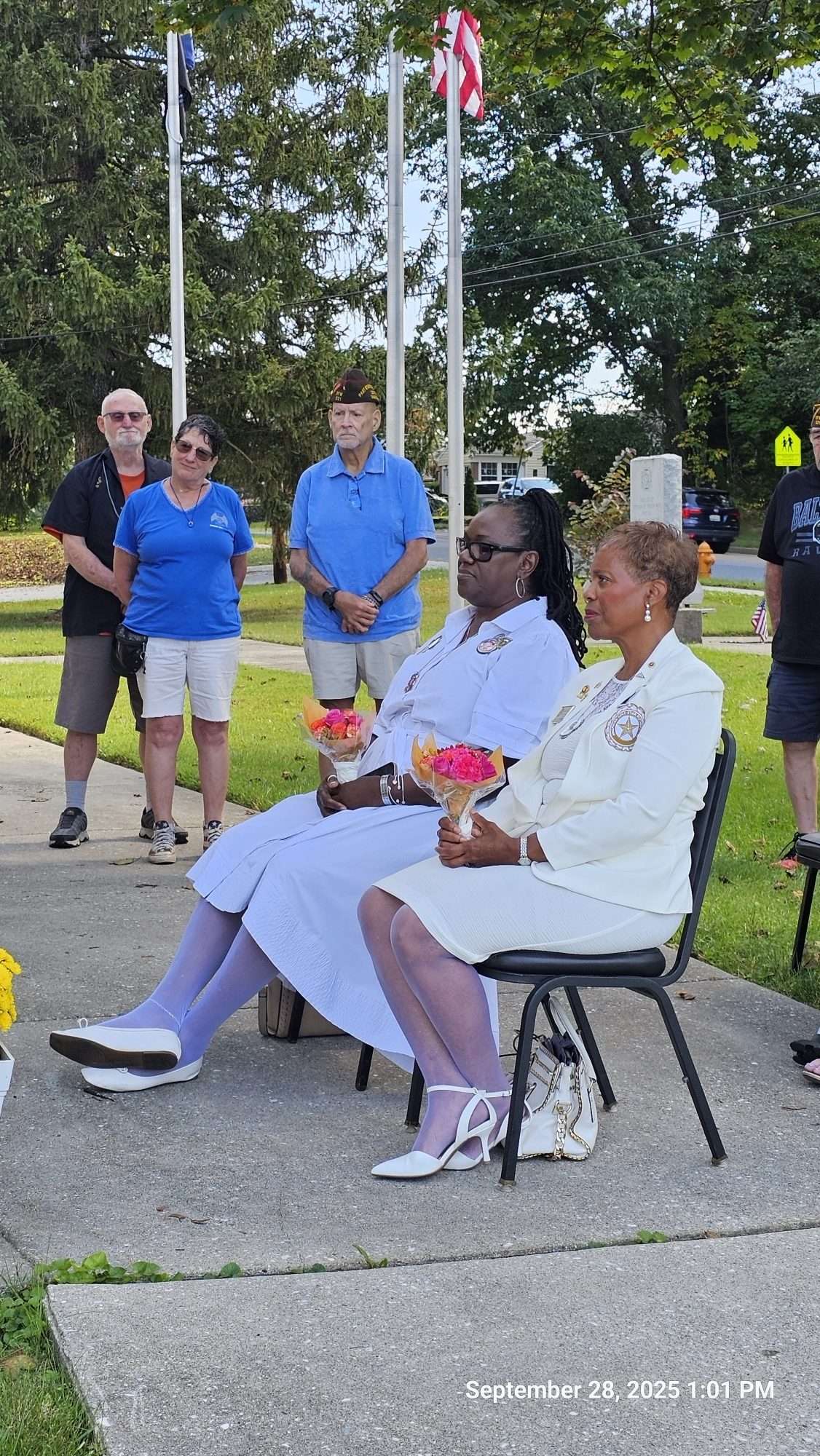 Prior to the ceremony the Auxiliary members placed Gold foiled stars inscribed with the name of fallen Heroes and Veterans on the windows in the canteen area. The ceremony was held outdoors in front of the beautiful Gold Star Memorial. After the ceremony, the mothers and families were presented with beautiful floral bouquets. Janice gave brief remarks and expressed thanks to the Auxiliary and Post members for continuing to honor fallen heroes, the families and for their unwavering support of Gold Star families. The Auxiliary is continuing their special project of selling Gold foiled stars to raise funds to maintain the Gold Star Memorial area.